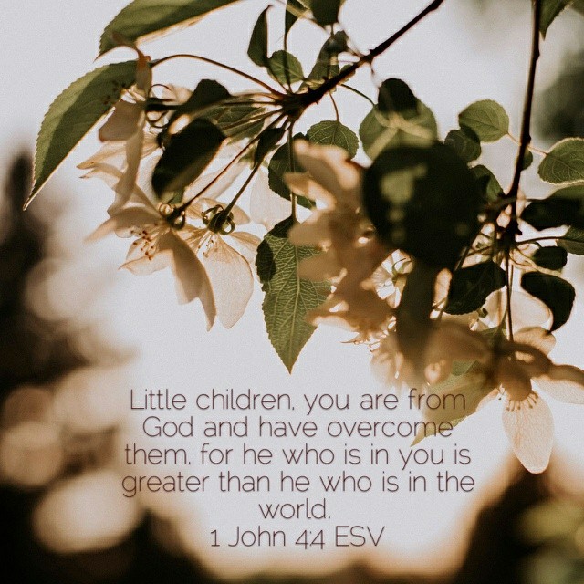 Victorious Inspirations 1 John 4:4 ESV Posted by Be Victorious Ministry on September 3, 2017 Little children, you are from God and have overcome them, for he who is in you is greater than he who is in the world. 1 John 4:4 ESV http://bible.com/59/1jn.4.4.ESV Share this: Click to share on Facebook (Opens in new window) Facebook Click to share on Pinterest (Opens in new window) Pinterest More Click to share on X (Opens in new window) X Like Loading... Related